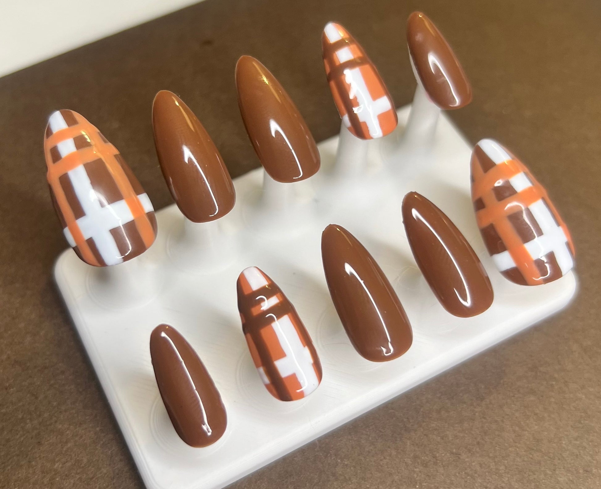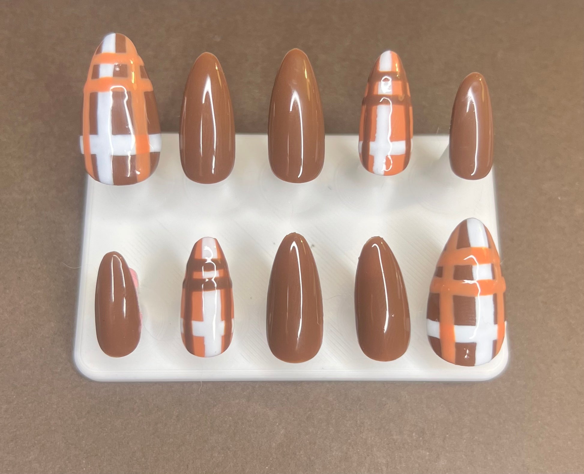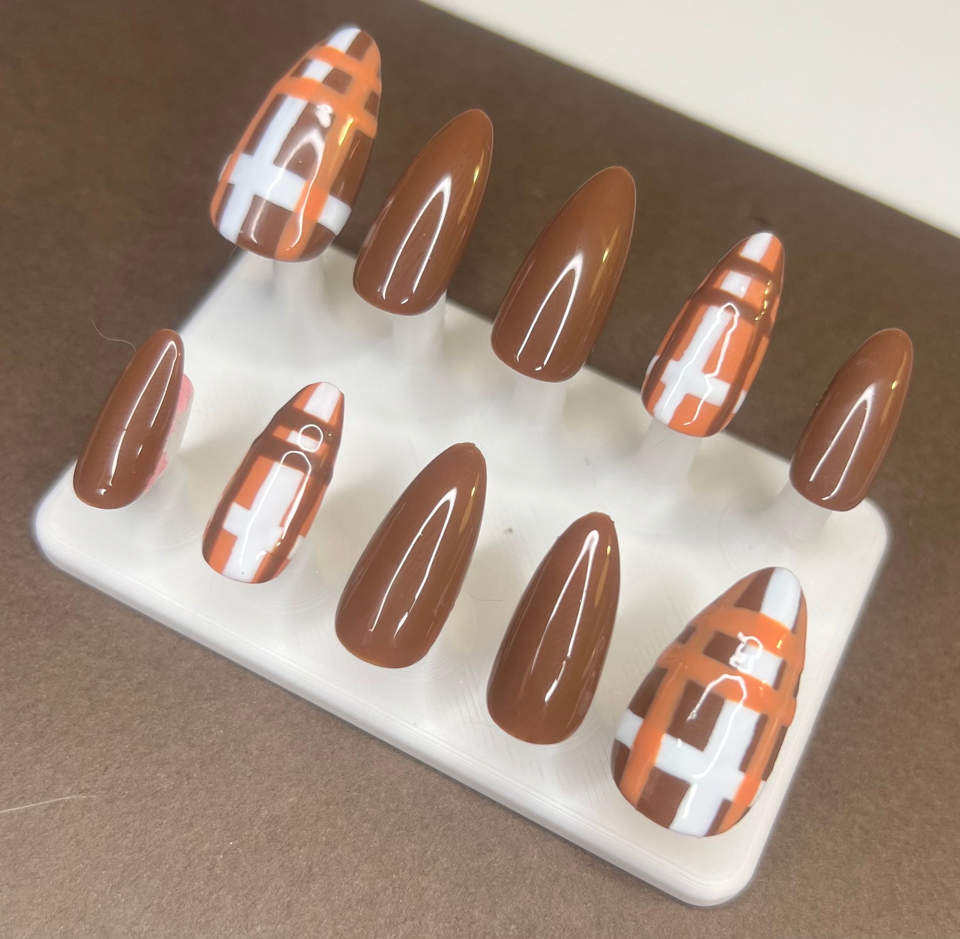Cozy, chic, and perfectly seasonal — Autumn Plaid is the ultimate fall-ready set. This glossy press-on features a warm brown base with hand-painted orange and white plaid accents, giving all the pumpkin-spice-and-cozy-sweater vibes.
