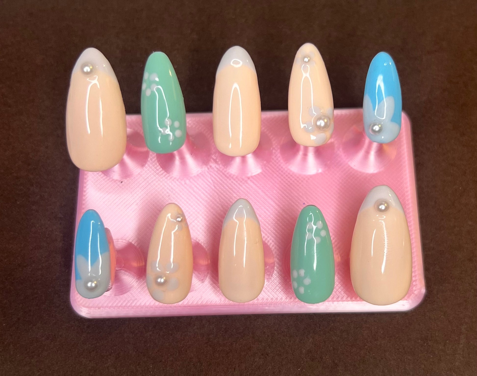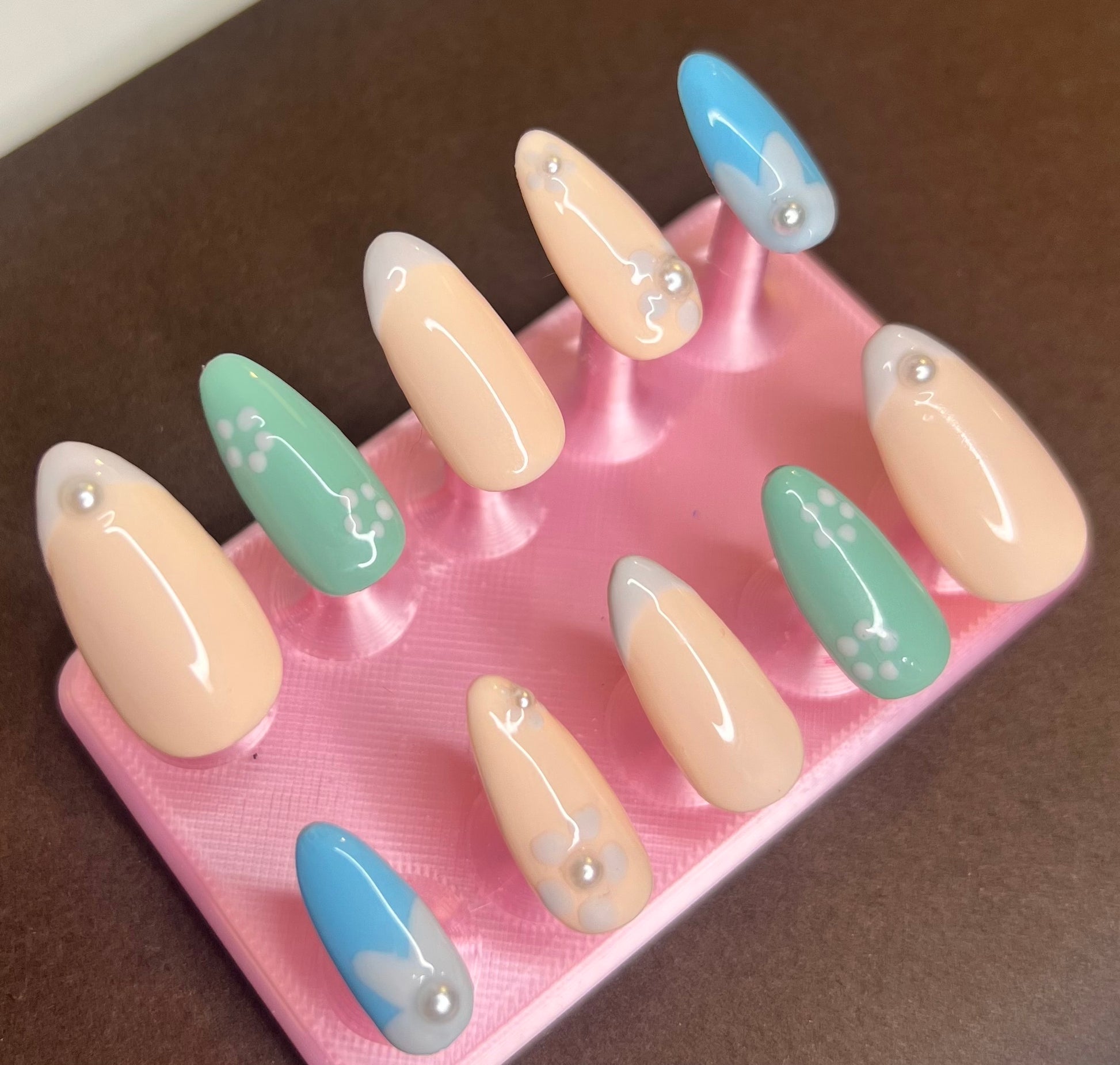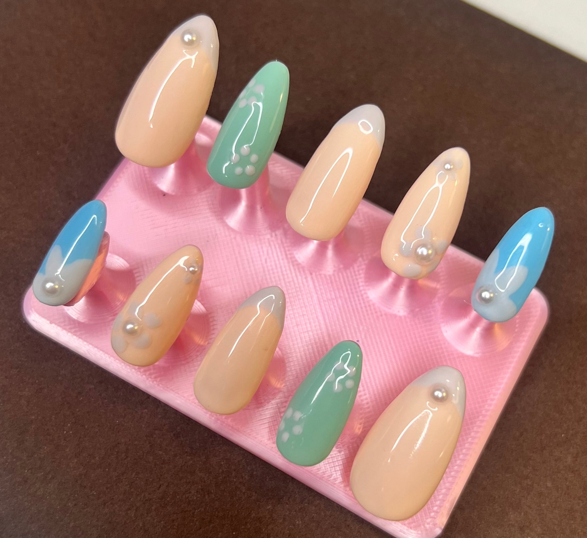Keep it soft, sweet, and effortlessly pretty — this almond set blends classic French tips with dreamy pastel hues. Accented with delicate pearl gems and dainty floral touches, it's the perfect mix of elegance and playful charm.