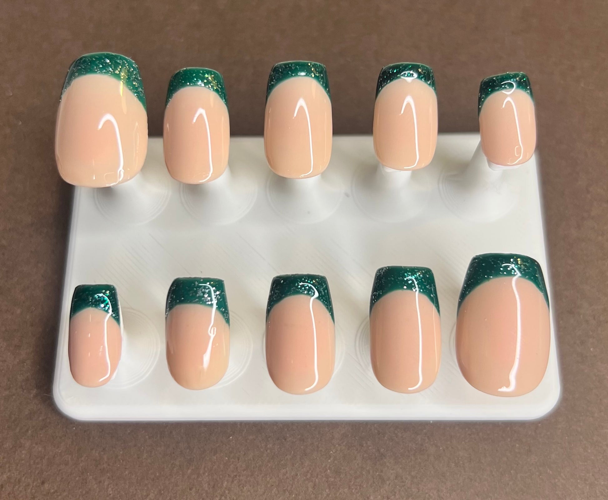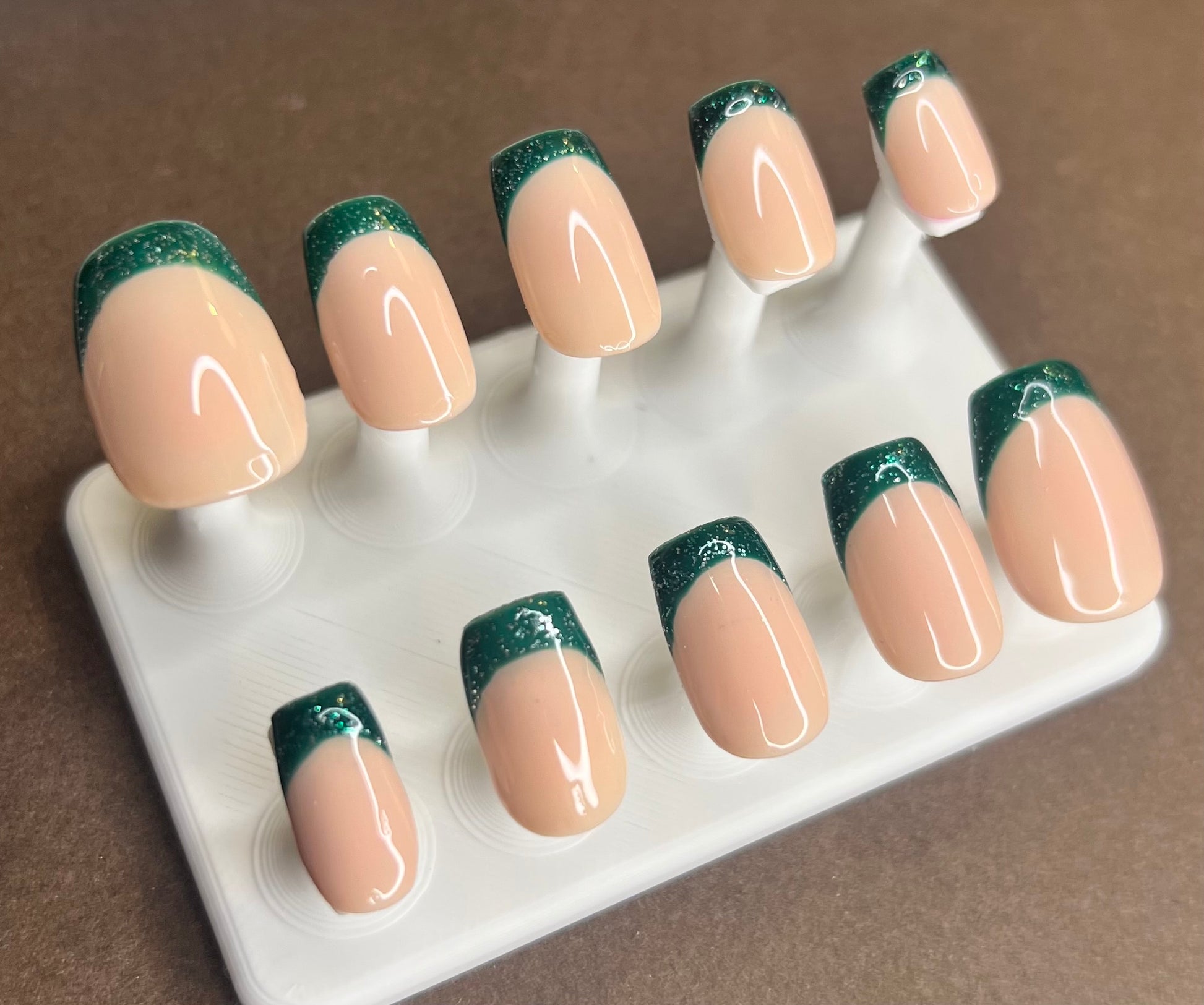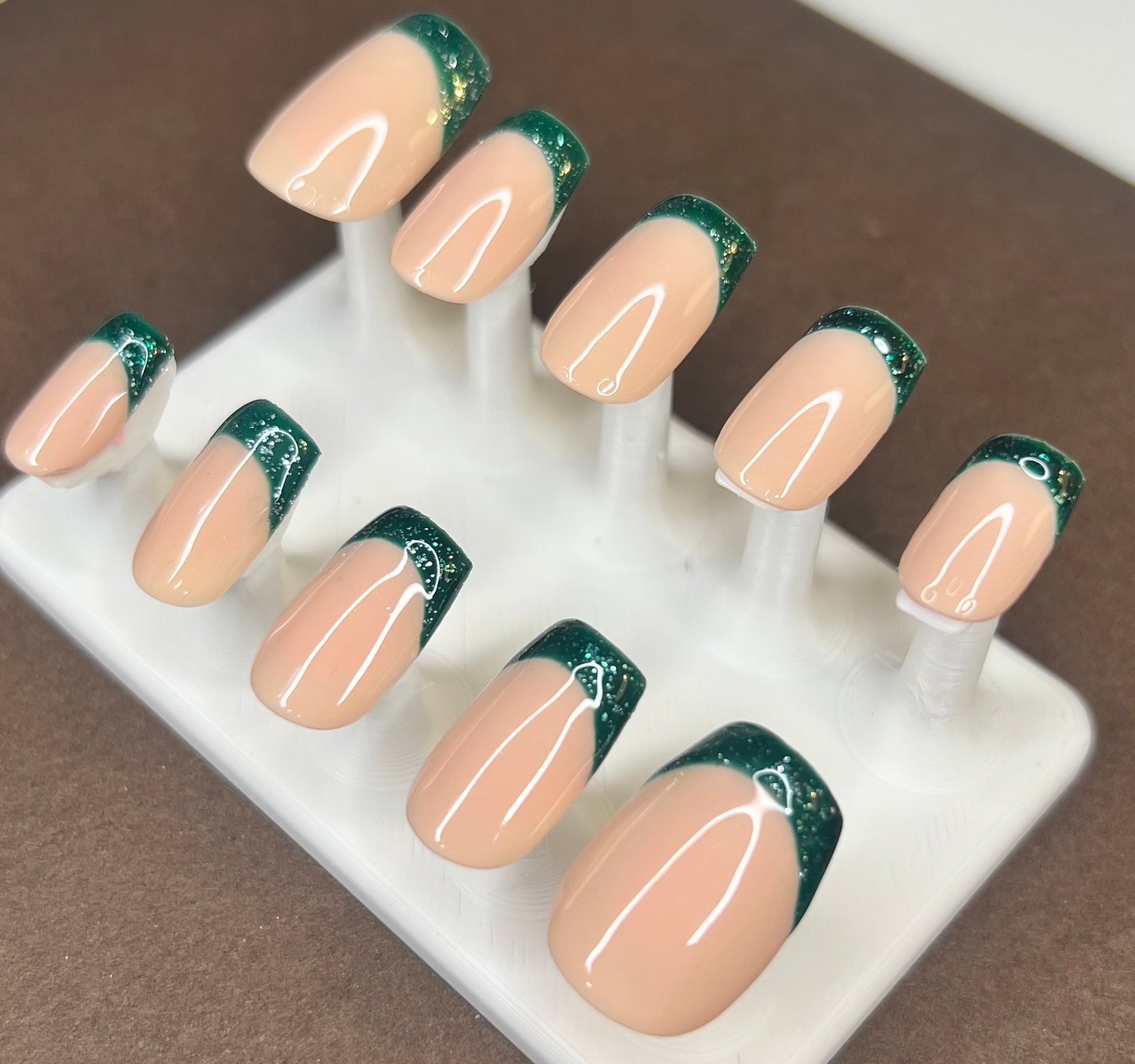 Enchanted Tips — Sleek, modern, and irresistibly chic, this press-on set brings a sophisticated twist to the classic French tip. Featuring deep emerald green tips kissed with a subtle shimmer, each handcrafted nail pairs rich color with a flawless glossy finish for an effortlessly elevated look.