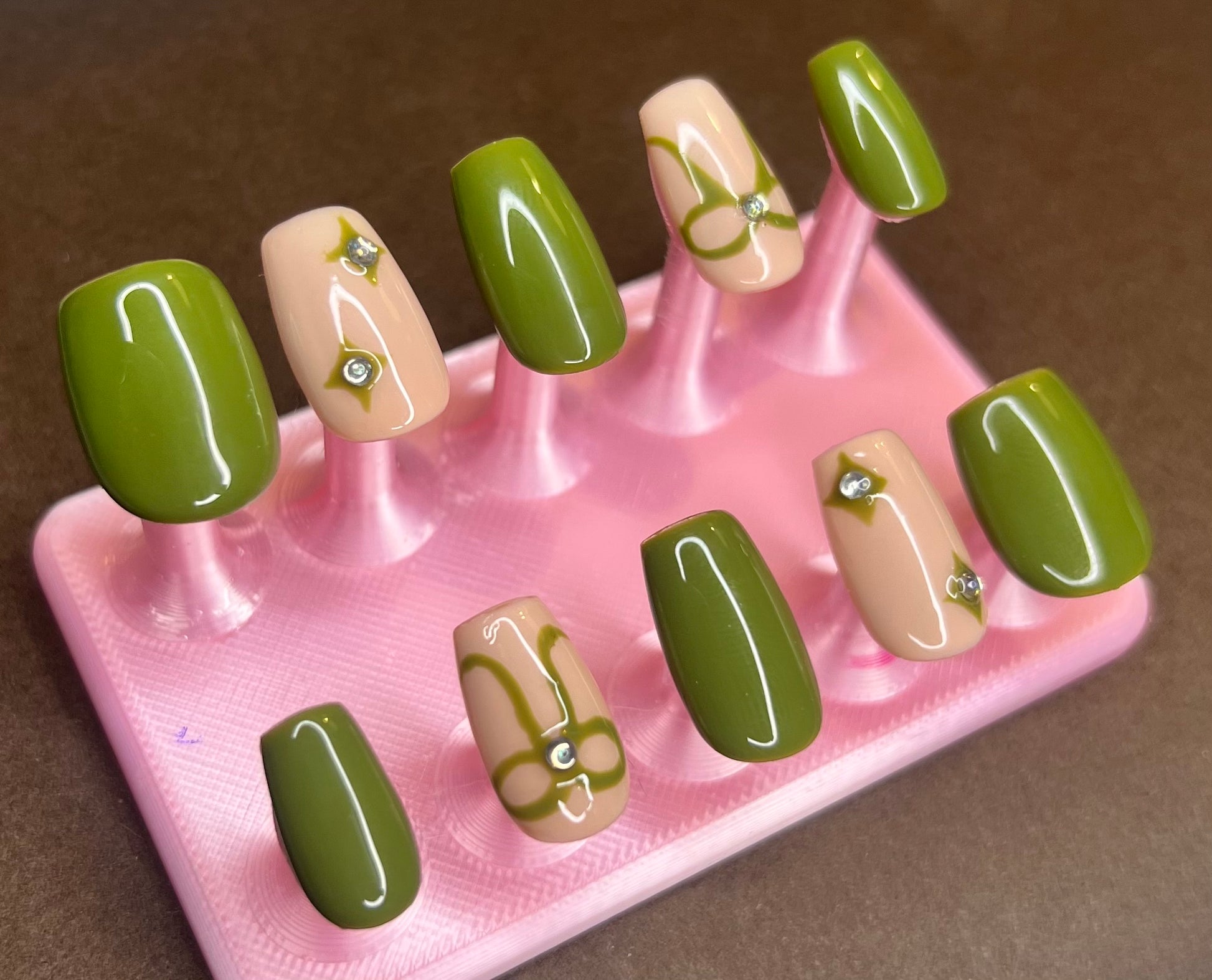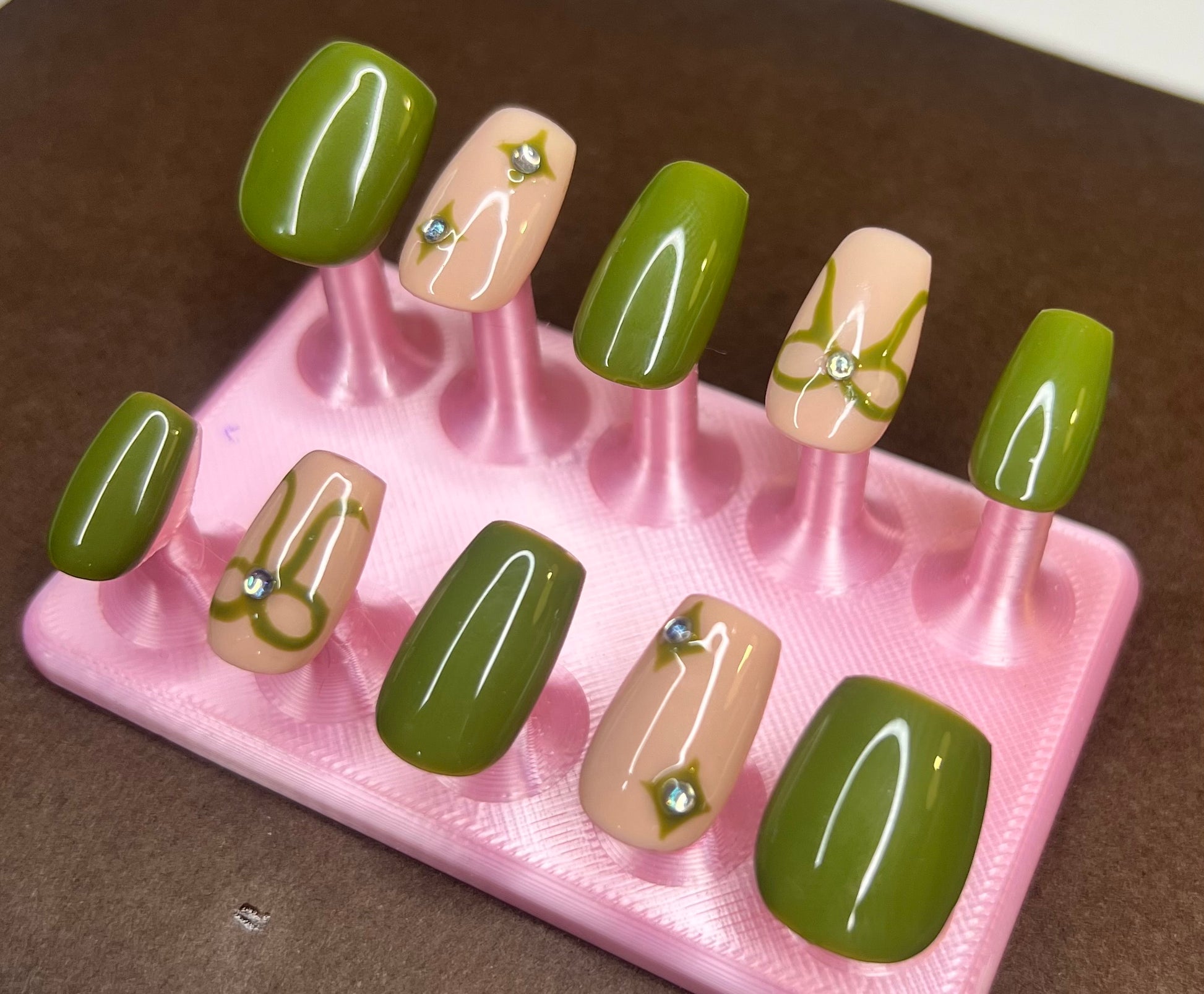 This glossy olive green and nude set is giving chic with a playful twist. Featuring bold solid greens, delicate bow accents, and crystal embellishments — she’s equal parts classy and fun.